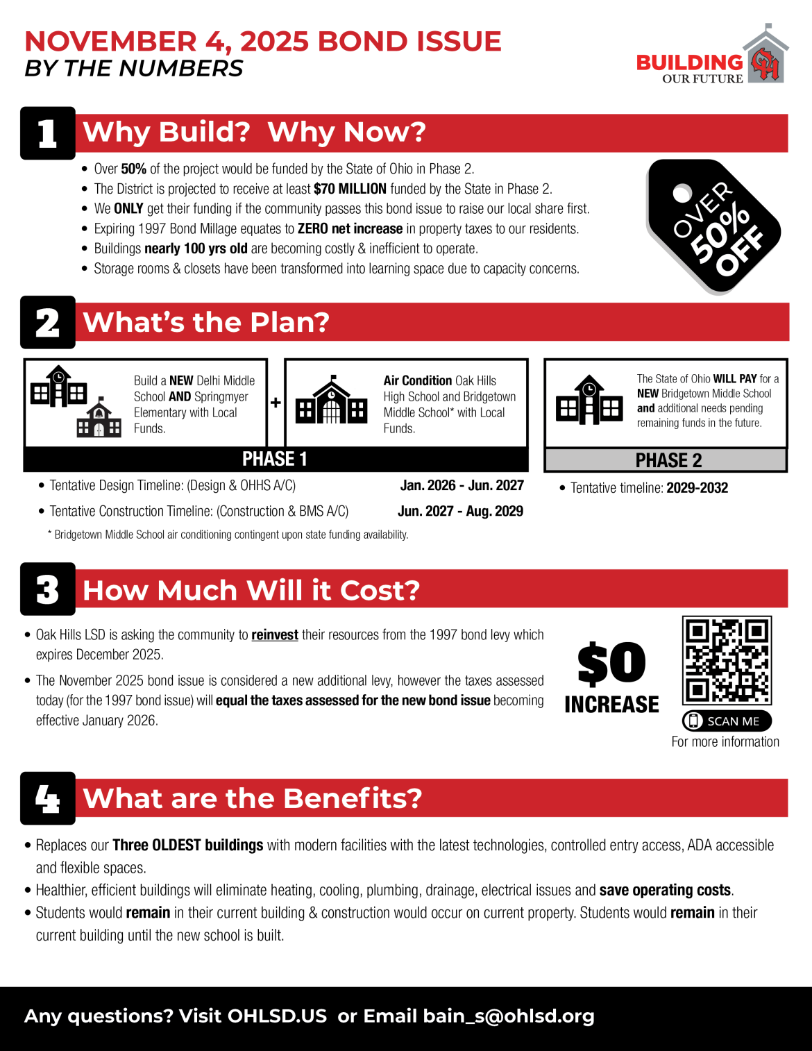 Oak Hills is moving forward with a smart plan to modernize our schools — many of which are nearly a century old — to ensure our students learn in safe, up-to-date classrooms. Through the state’s Expedited Local Partnership Program, at least 50% of the cost will be covered by Ohio, bringing more than $70 million in state funding into our community.